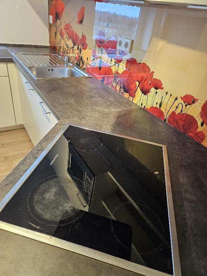 Die großzügige Einbauküche mit Fenster verfügt über einen 4-Platten-Ceranherd, Abluftanlage, ein in der Arbeitsplatte eingearbeitetes Cernan-Schneidbrett, Spülmaschine, Spüle sowie über eine Kühl- und Gefrierkombination. Weiterhin ist in der Küche eine sehr praktische Küchentheke mit schönen neuen weißen Dreh-Barhockern installiert.