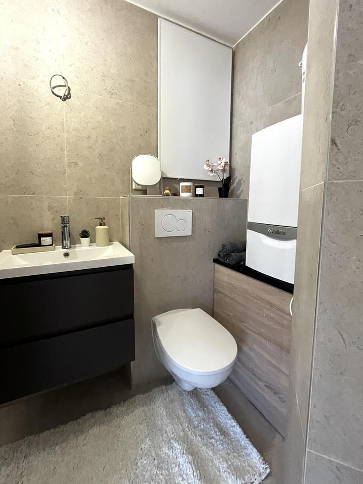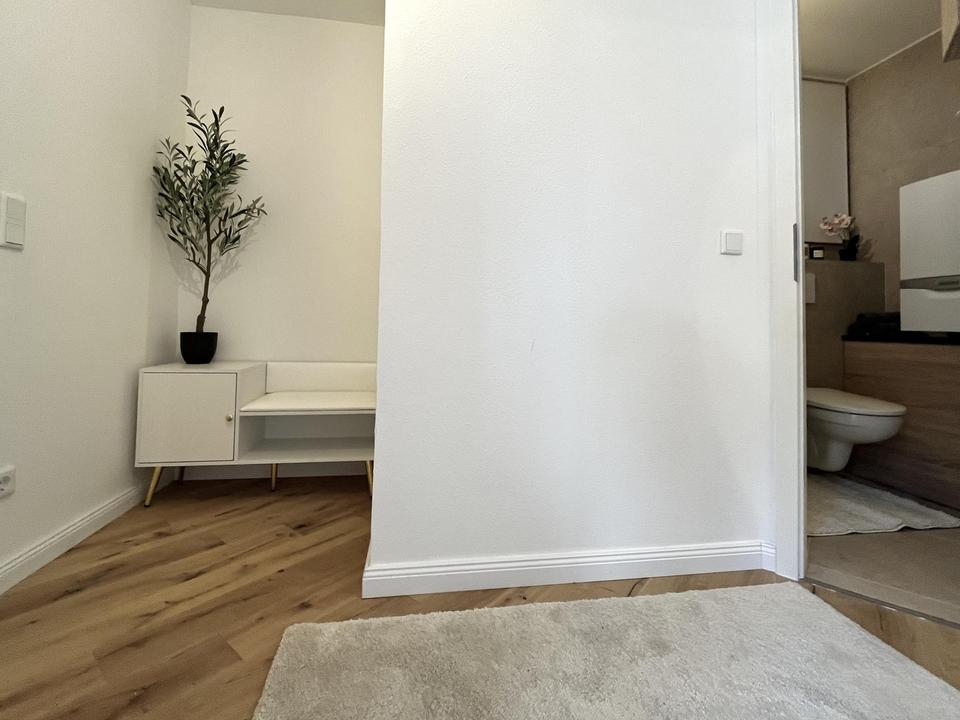 Ein besonderes Highlight ist das hochwertige Echtholzparkett aus Eiche, das den Wohnräumen eine warme und elegante Atmosphäre verleiht. Das modern gestaltete Badezimmer wurde ebenfalls vollständig erneuert und verfügt über eine großzügige Regendusche.
