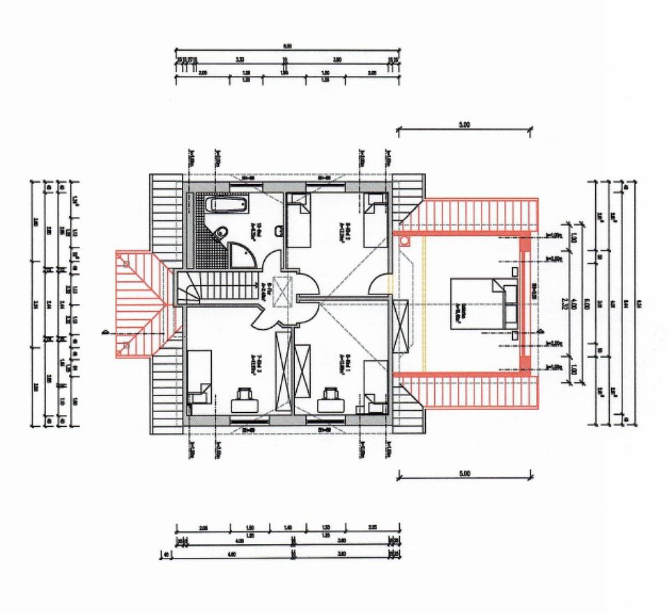 Das Obergeschoss beeindruckt mit einem ca. 30 Quadratmeter großen Schlafzimmer. Die offene Balkendecke und der maßgefertigte Einbauschrank, der bis unter den First reicht, schaffen ein exklusives Ambiente. Das 3 Meter breite Giebelfenster mit Glasbrüstung ermöglicht einen traumhaften Blick auf den Pool.