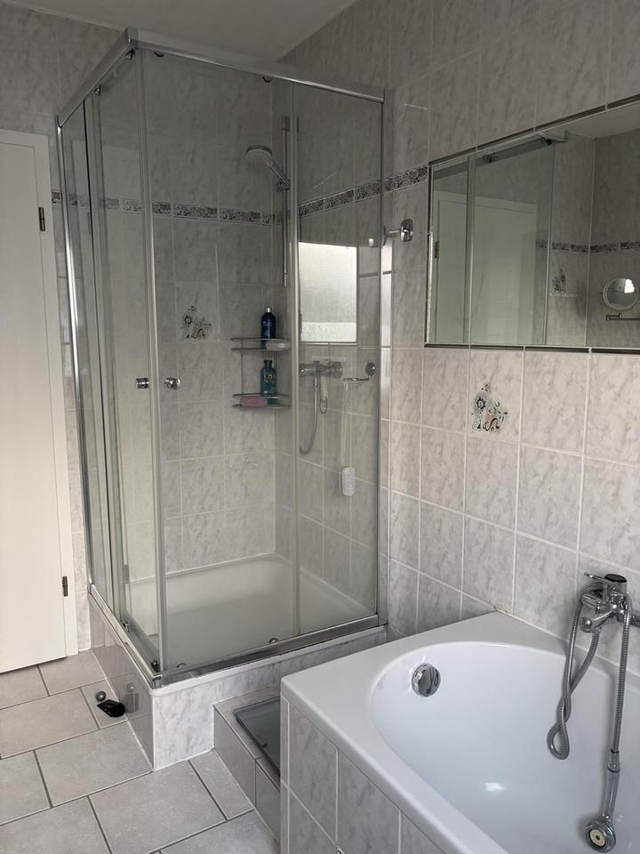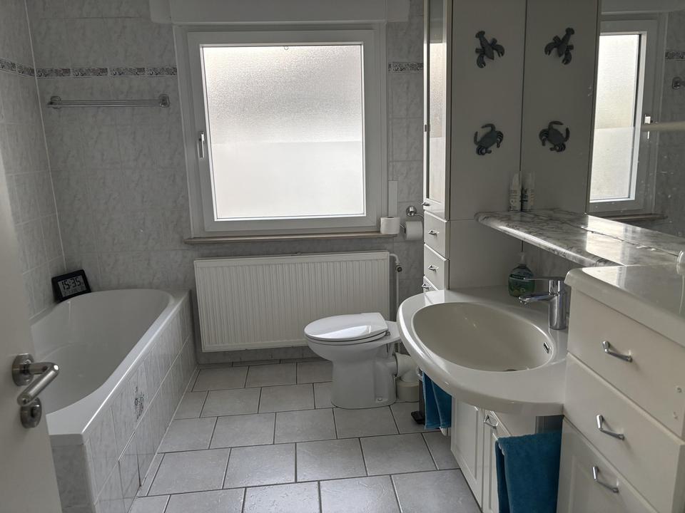 – Badezimmer mit Fliesen. Enthalten sind WC, Badewanne und separater Dusche