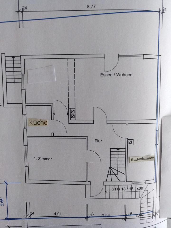 Im OG befinden sich ein neues Duschbad und 4 Zimmer, davon ist derzeit eine Küche eingerichtet.