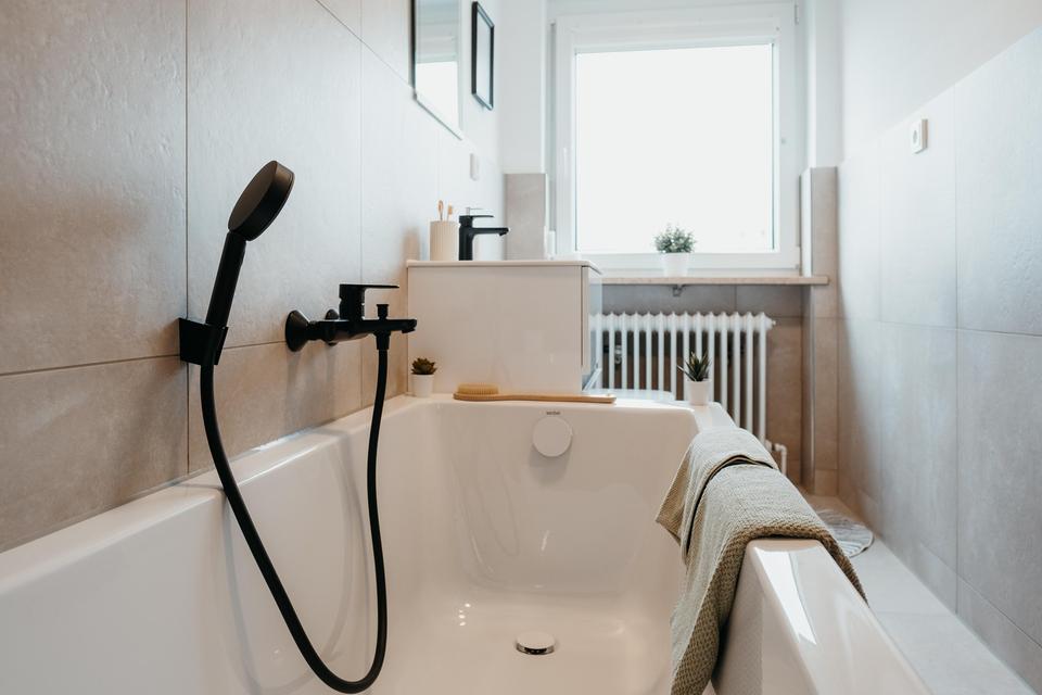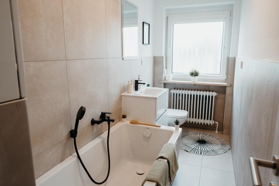 -> Komplettrenoviertes Bad: Neue Badewanne, Toilette und Waschtisch mit Unterschrank