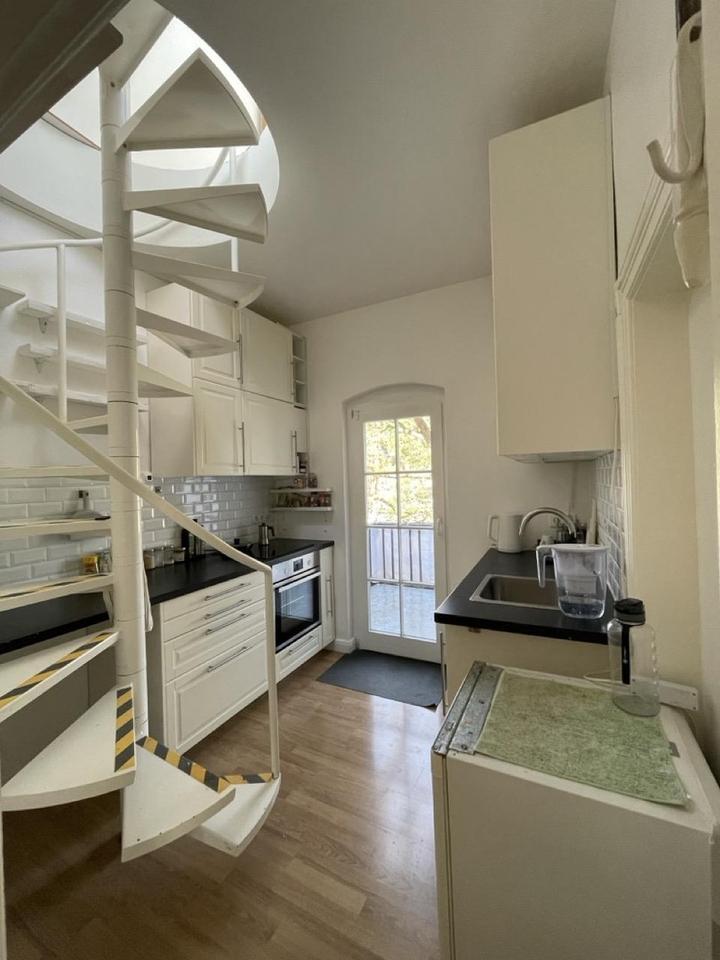 Vollausgestattete Einbauküche mit Übergang zum Balkon sowie Zugang zum Turmzimmer