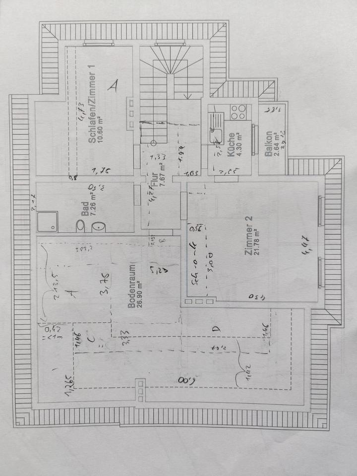 Die Wohnung befindet sich im 2. Obergeschoss (Dachgeschoss) und ist über ein Treppenhaus ohne Aufzug erreichbar.