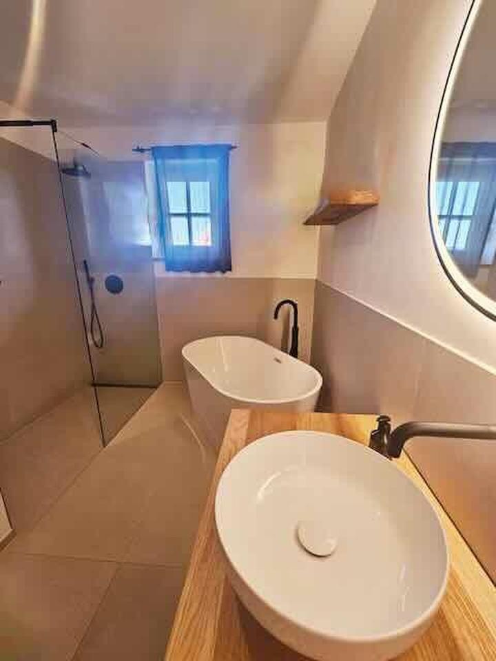 Badezimmer: Walk-in-Dusche, freistehende Wanne, Waschtisch, Fliesen