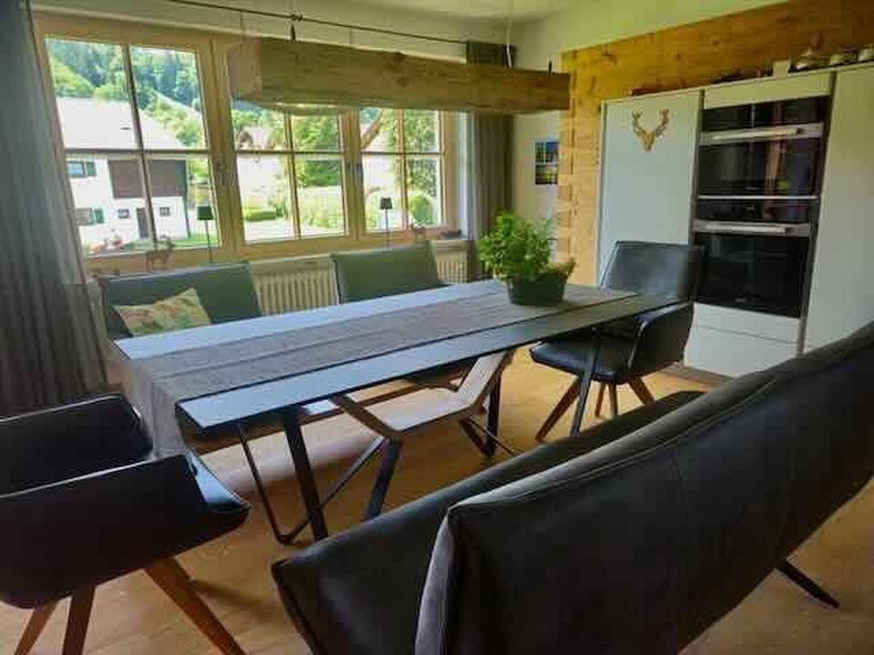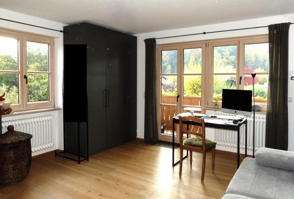 Das Obergeschoss erhielt durch den Umbau in 2023 einen großzügigen Wohn-/Essbereich mit offener moderner Küche im alpenländischen Stil und High-End-Elektrogeräten. Der angrenzende Balkon Richtung Süden erstreckt sich überdacht und mit zwei Markisen bestückt bis zum östlichen Ende mit Blick auf die Salzburger Bergwelt. Hier gibt es einen weiteren Zugang in das sonnendurchflutete Eckzimmer, welches in südöstlicher Himmelsrichtung liegt. Im zweiten separaten Zimmer wird man im Zirbenbett von der Sonne geweckt und schaut direkt auf den Gaisberg.