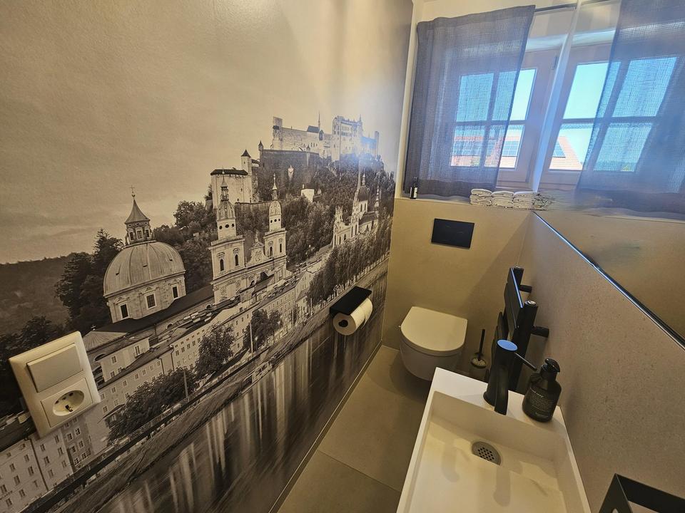WC: großer Spiegel, Fototapete (Salzburg), großformatige ital. Fliesen