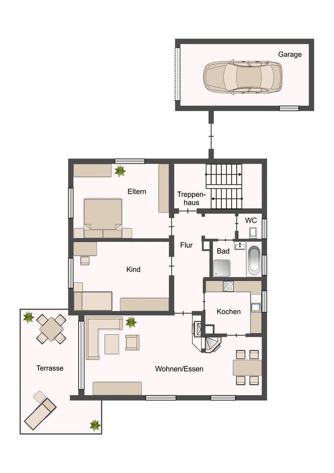 Die Grundrisse sind funktional und gut proportioniert, mit hellen Räumen und einer klaren Aufteilung. Terrasse, Balkon sowie der weitläufige Gartenbereich unterstreichen den Wohnkomfort und bieten vielfältige Nutzungsmöglichkeiten.