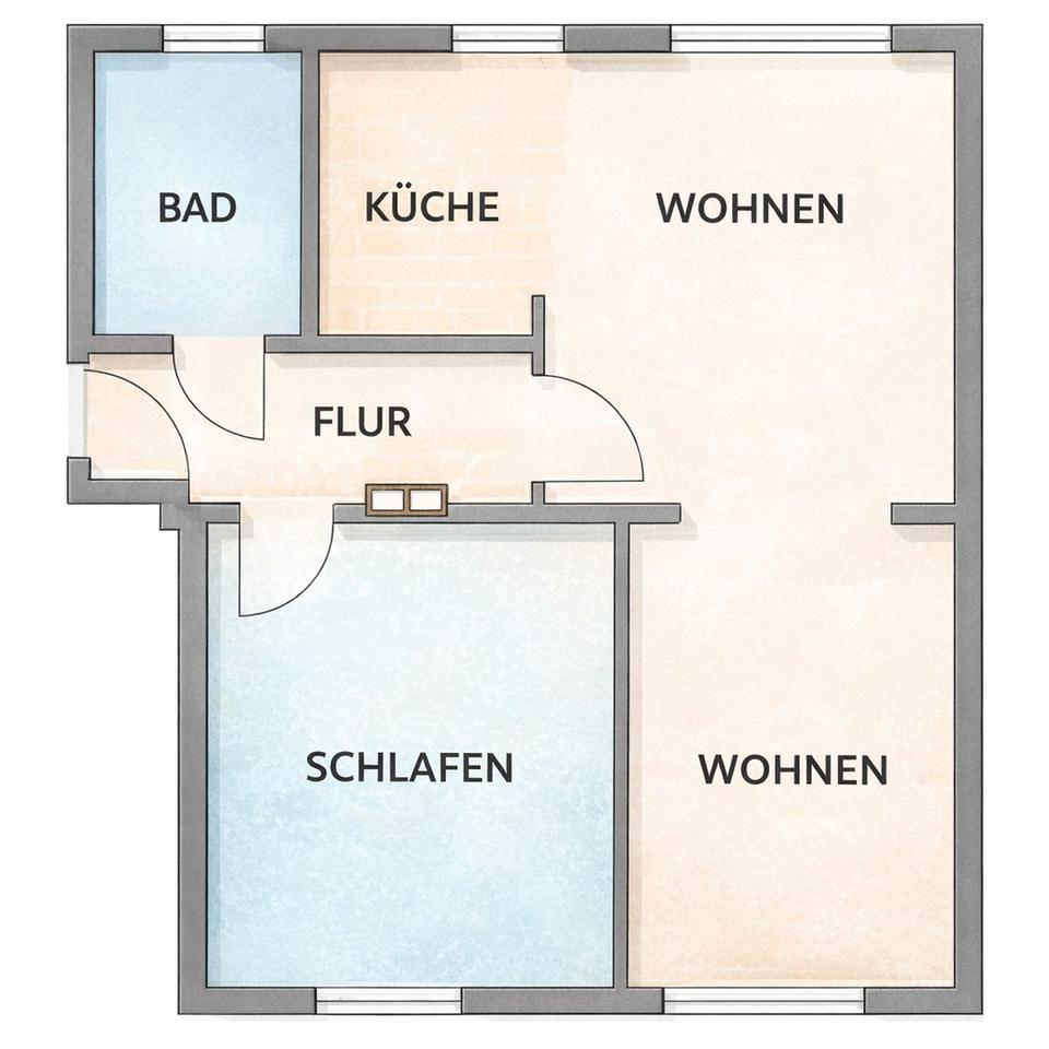Die Wohnung betreten Sie über einen langgezogenen Flur, der ausreichend Platz für eine Garderobe bietet. Von hier aus gelangen Sie direkt in das Wohnzimmer, das Schlafzimmer sowie das Badezimmer.