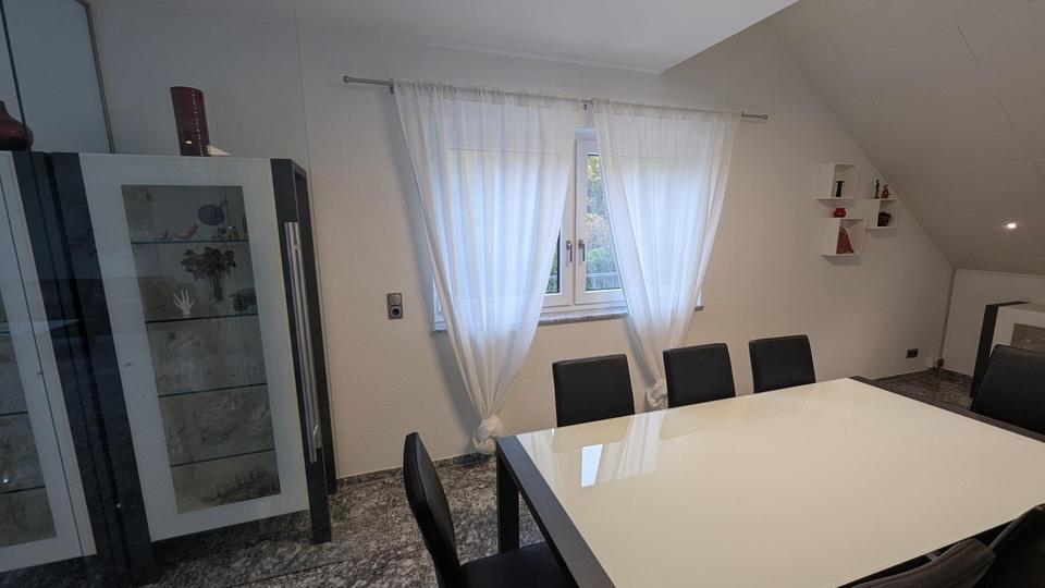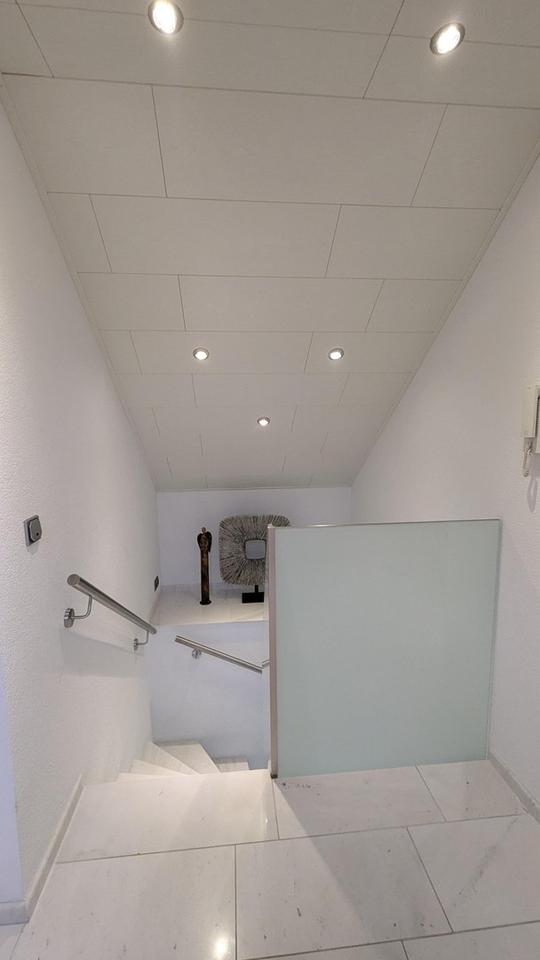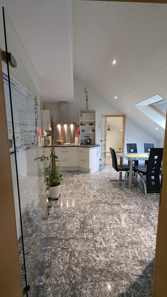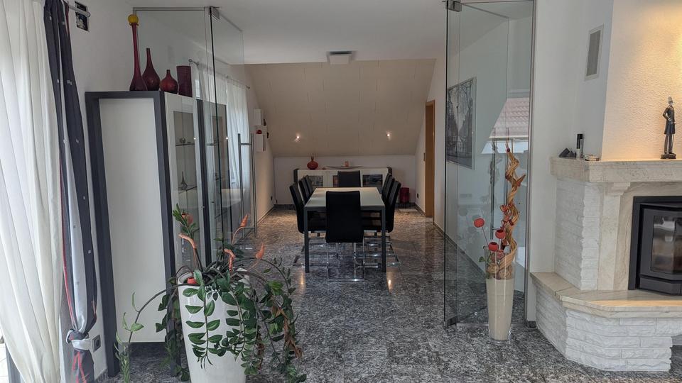 Die Wohnung besticht durch eine gehobene Innenausstattung mit Granitfußboden und bietet auf der unteren Ebene eine Diele, ein großes Wohnzimmer mit Kamin, ein Esszimmer, welches durch eine Glaswand getrennt sind, eine ausgestattete Küche, eine Abstellkammer, ein gefliestes Schlafzimmer mit Ankleide und ein gefliestes, sehr großes Bad mit zwei Waschbecken, Bidet, bodenebene Dusche und Whirlpool, einfach eine schöne Entspannungsoase!