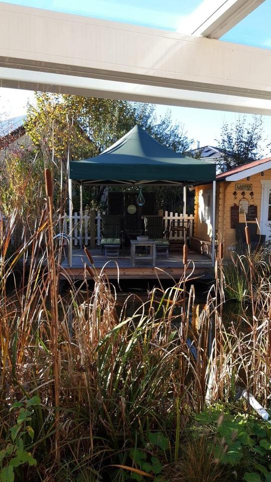 Zweiter Sitzplatz auf dem Steg (Lärchenholz) direkt am Wasser mit Treppe in den Teich, 11 m² groß