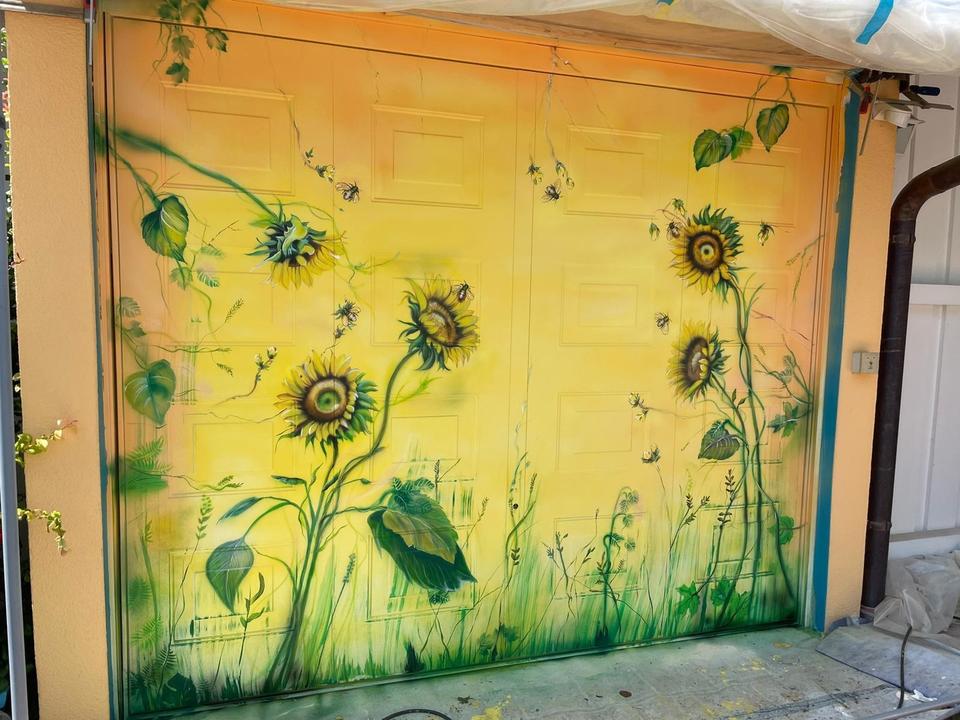Die Garage hat ein gedämmtes Schwenktor und ist komplett mit dem Bild (Sonnenblumen und Bienen) einer Airbrush-Künstlerin verziert