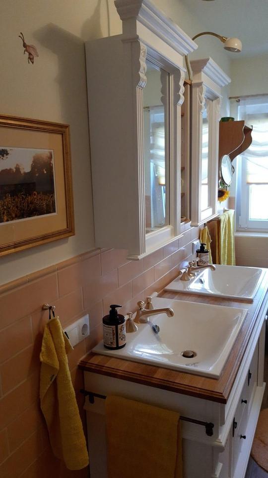 Im Badezimmer im OG zusätzlich freistehende Badewanne (Villeroy & Boch) und gemauerte Sitzgelegenheit in der Dusche