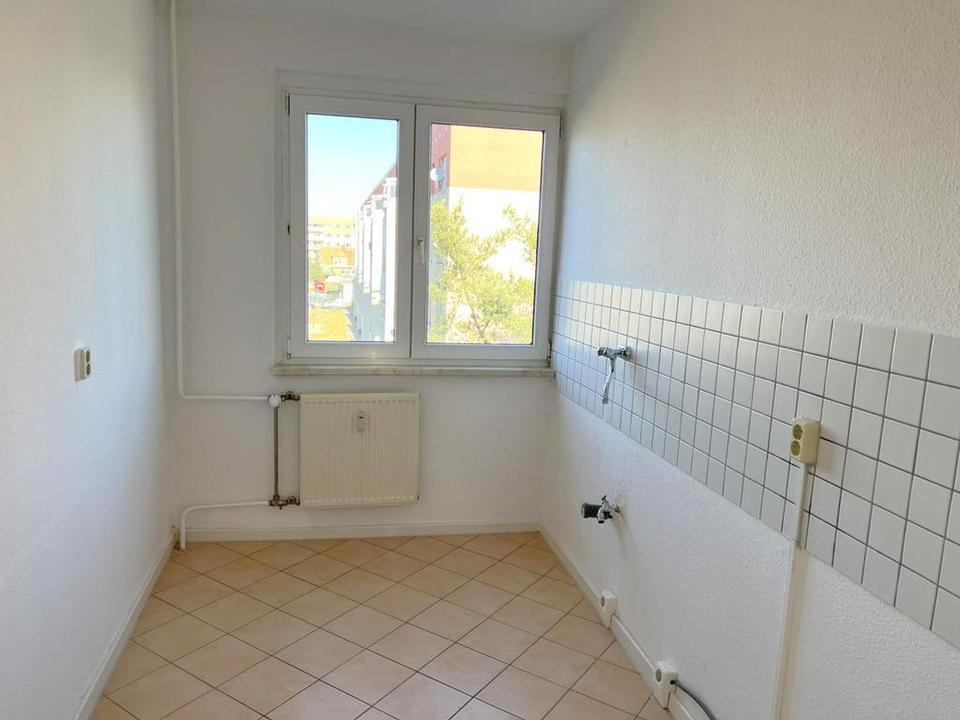 Küche mit System: Alle notwendigen Anschlüsse sind vorhanden, inklusive installierter Eckventile. Ein klassischer Fliesenspiegel schützt die Wände und ist bereit für Ihre Traumküche.