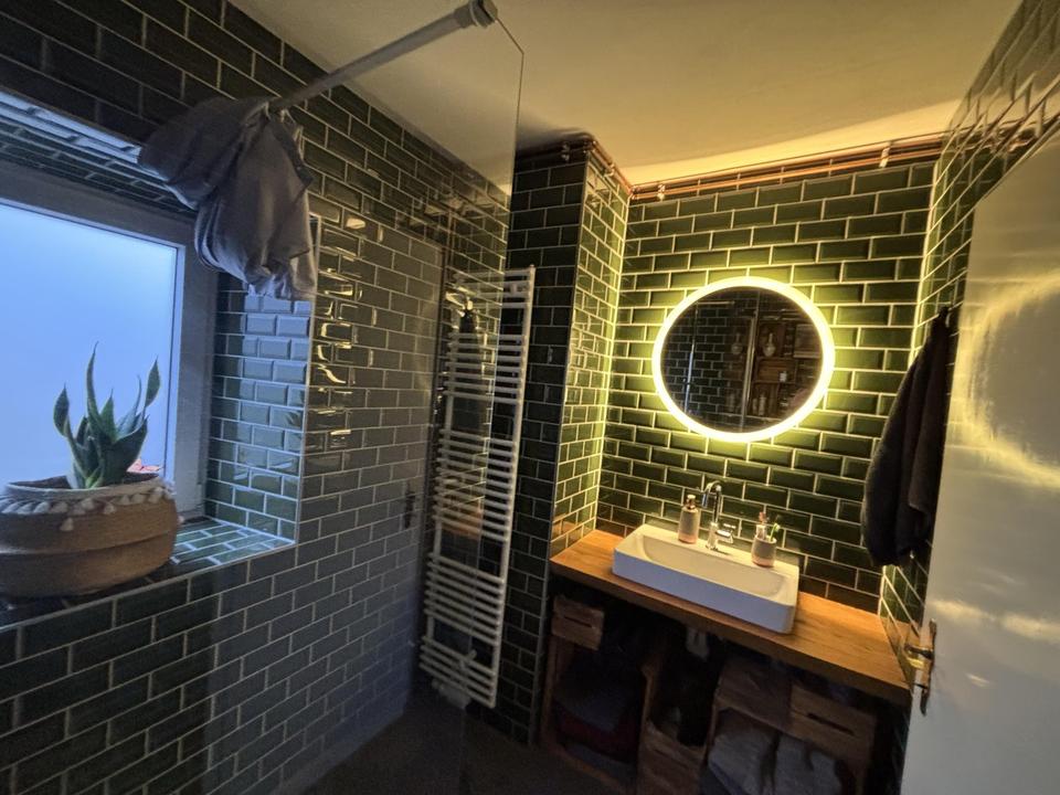 Man betritt das von außen eher unscheinbar wirkende Haus u. steht in einem großzügigem Entree-Bereich, eingefasst durch eine, in ihrer Optik interessanten Kappendecke. Der Raum öffnet sich in der Höhe durch die elegante Treppe mit ihren edlen Holzstufen und ermöglicht dadurch interessante Blickwinkel, bzw. Sichtachsen innerhalb des Hauses. Zur Linken befindet sich ein sehr großzügiges Familienbad mit Badewanne, zwei Waschtischen, einer Dusche und einem durch eine Schamwand getrenntes WC.