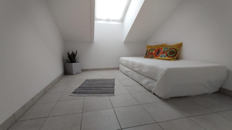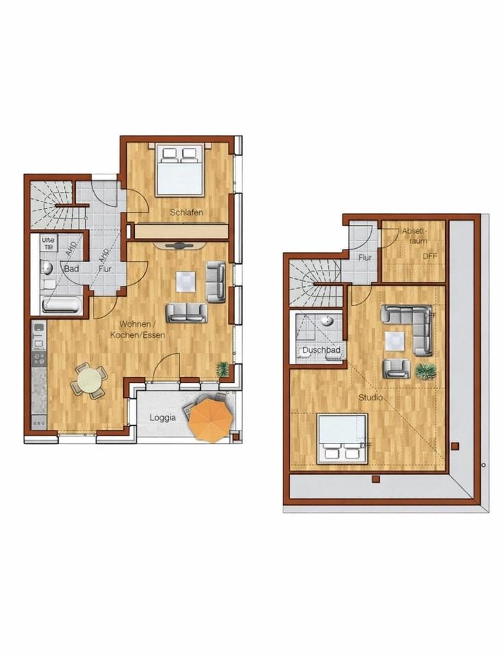 Über eine Innentreppe oder alternativ über den separaten Eingang vom Treppenhaus gelangen Sie in die obere Etage. Dort befinden sich ein einladendes Gäste-/Wohnzimmer, ein kleines Studio und ein eigenes modernes Duschbad – ideal für individuelles Wohnen, Homeoffice oder als Rückzugsbereich, z.B. für eine WG.