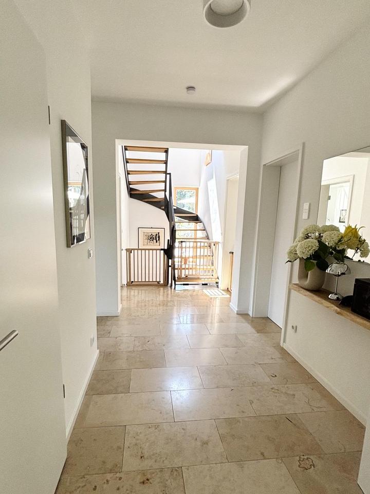 Das freistehende Einfamilienhaus liegt auf einem schönen Gartengrundstück mit Südausrichtung in einer begehrten und ruhigen Lage von Berlin-Wannsee. Es wurde 2021 umfassend und energieeffizient saniert (Energieeffizienzklasse B) und bietet auf drei Ebenen helle, lichtdurchflutete Räume. Hochwertige Materialien wie Eichenparkett und Naturstein prägen das Haus, ergänzt durch eine moderne Küche mit Naturstein. Besonders angenehm sind die drei Terrassen, inklusive einer Dachterrasse – zwei davon mit Südausrichtung und Teilblick auf den Wannsee. Eine Garage sowie weitere Stellmöglichkeiten sind ebenfalls vorhanden.