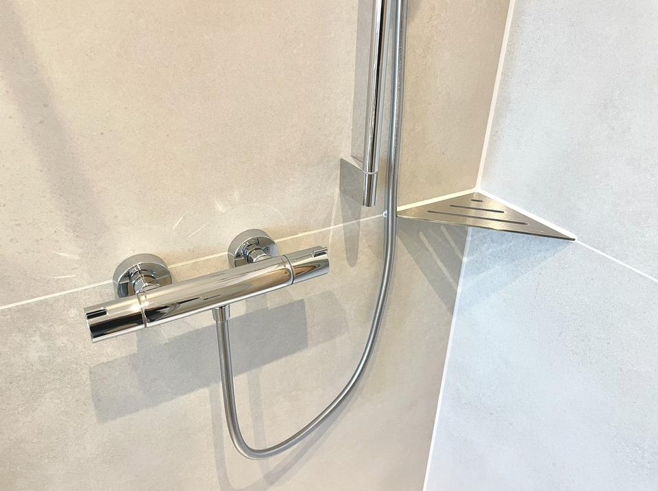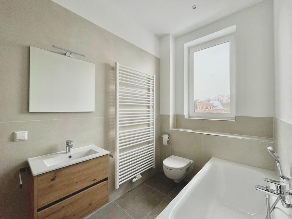 Das moderne Tageslichtbad, das im Jahr 2026 neu gefliest wird, ist mit einer großen Dusche, einer Badewanne sowie einem Handtuchheizkörper ausgestattet. Es werden hochwertige Materialien und Armaturen namhafter Hersteller verbaut – darunter ein spülrandloses WC, eine Thermostatarmatur in der Dusche sowie großformatige Feinsteinzeugfliesen und indirekte Beleuchtung.