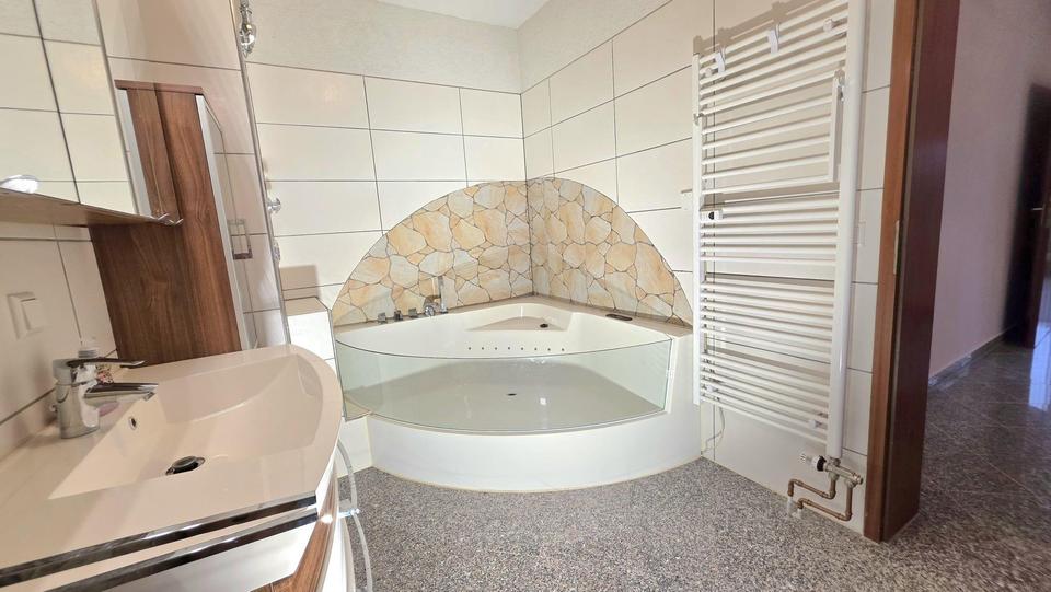 Bad en Suite mit Eckbadewanne, WC und Waschbecken