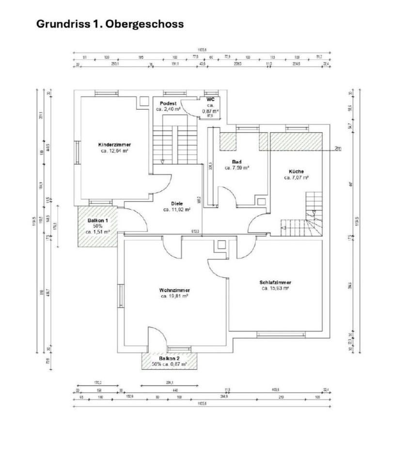 Gesamt kalkuliert haben wir circa 172 m2 Wohnfläche und über 160m2 Nutzfläche.