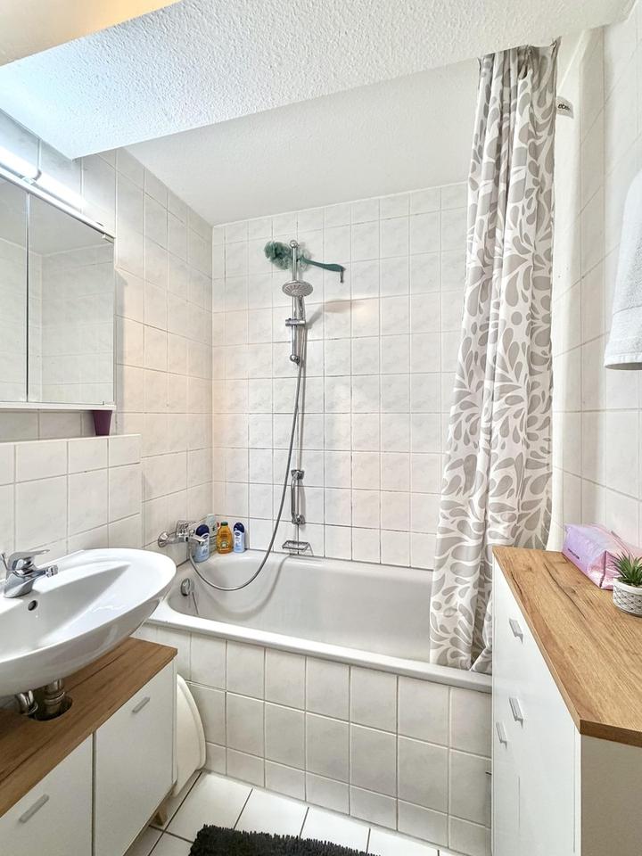 Die Ausstattung der Wohnung ist als normal und gepflegt zu beschreiben und bietet zeitgemäßen Komfort. Das Laminat im Flur, Wohnzimmer und Schlafzimmer wurde 2025 neu verlegt. Das moderne Badezimmer ist mit einer entspannenden Badewanne sowie einem praktischen Waschmaschinenanschluss ausgestattet. Für zusätzlichen Komfort im Alltag sorgt ein separates Gäste-WC. Ein besonderes Highlight ist die offene und helle Küche, die hochwertige Einbauküche inklusive aller Elektrogeräte kann auf Wunsch unkompliziert vom Vormieter übernommen werden oder eine eigene Einbauküche eingebracht oder auf Wunsch eine Küche vom Vermieter gestellt werden. Innerhalb der Wohnung bietet ein Hauswirtschaftsraum wertvollen Stauraum für die tägliche Organisation. Ein zusätzlicher Abstellraum im Keller sowie ein eigener Tiefgaragenstellplatz, der bereits in der Gesamtmiete enthalten ist, runden das attraktive Angebot ab. Die Beheizung erfolgt effizient über eine Gas-Zentralheizung.