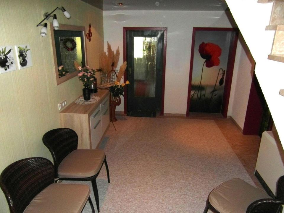 Große beheizbare Diele mit Lackspanndecke und Strahlern. Das kleine Bad (ca. 3,5 m²) mit ebenerdiger Dusche, WC, Waschplatz und Fußbodenheizung befindet sich im Ausgangsraum zum Garten (ca. 13 m²). Dieser besticht mit Einbauschränken, Lackspanndecke und Einbaustrahlern.
