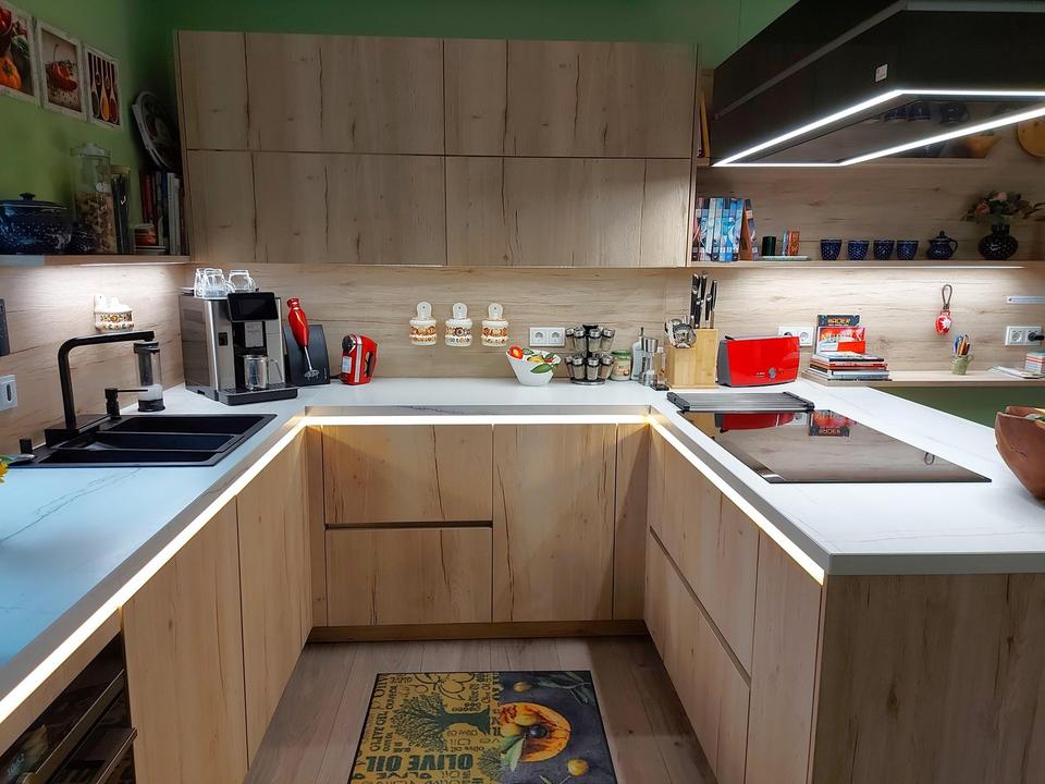 Offener Wohn-/Essbereich & Küche (ca. 55 m²): Ein weitläufiges Raumensemble mit lichtdurchflutetem, gemütlichem Eßbereich im Erker, moderner Einbauküche inkl. großem Induktionskochfeld, Lifthaube, Backofen mit Dampf, Siemens-Elektrogeräten, viel Stauraum und modernem Lichtkonzept.