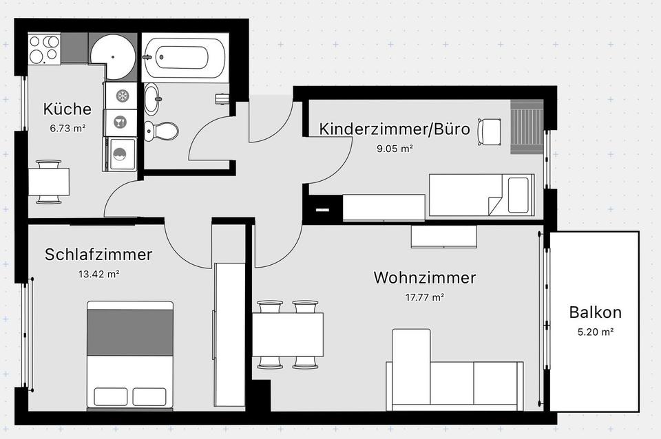 Effiziente Raumnutzung. Drei Zimmer, wobei das dritte eigentlich ein halbes Zimmer ist. Ideal als als Büro fürs Homeoffice oder ein kleines Kind.