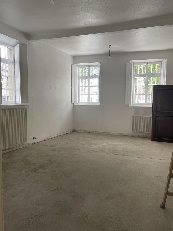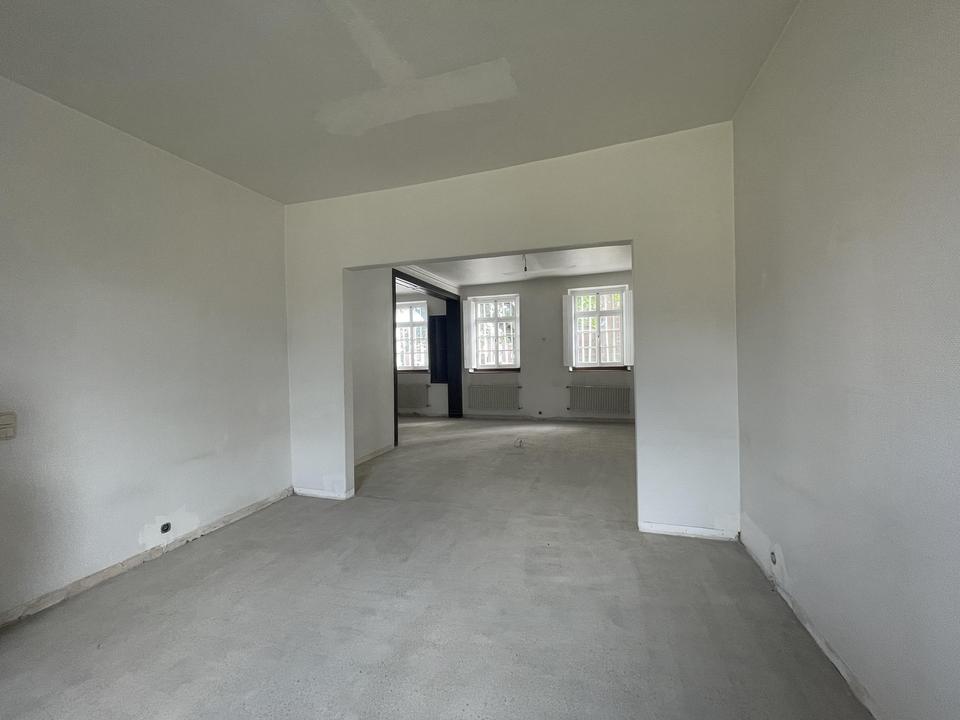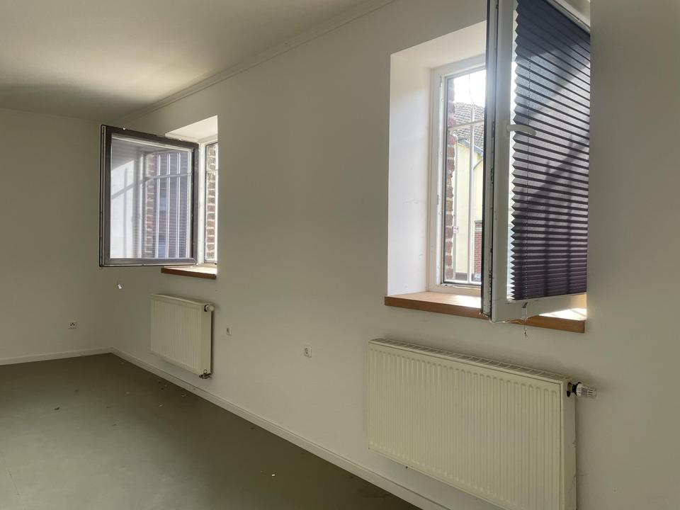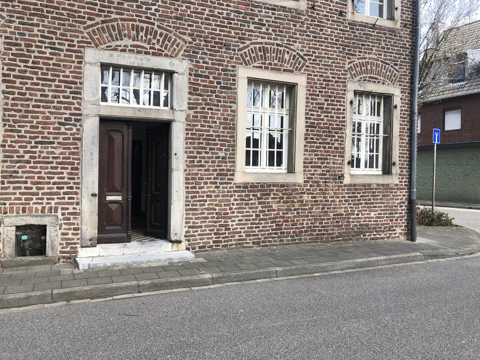 – Angeboten wird eine helle und repräsentative Bürofläche in einem denkmalgeschütztem Gutshaus von 1729 von ca. 100 m2. Betreten wird das Büro durch die historische Eichenholztüre. Dahinter liegt der mit Originalboden ausgelegte Eingangsbereich, über den man beide Büroräume erreicht. Rechterhand befindet sich der kleinere, lichtdurchflutete Raum von ca. 25m2. An diesen sind über einen kleinen Flur die Teeküche und das WC angebunden. Linkerhand befindet sich der größere der beiden Räume mit ca. 50m2. Auch hier geben die drei großen, alten Holzfenster den Blick auf die Holzweiler Kirche St. Cosmas und Damian frei. Ein weiteres Fenster überblickt den Innenhof. Die großzügige Deckenhöhe von 3,20m trägt zur großzügigen Büroatmosphäre bei. Aktuell werden noch kleinere Renovierungsarbeiten durchgeführt, neue Bilder folgen sobald diese abgeschlossen wurden. Teeküche und WC haben eine Deckenhöhe von ca. 2,10m und sind in gepflegtem Zustand. Anschluss an eine Highspeed Internetleitung bis zu 250 MBit/s ist möglich. Ausstattung: Böden: Fliesenboden, Büroräume abgeschliffener Betonboden mit eleganter Optik, vermietet wird das Objekt ohne Einrichtung Fenster: Holzfenster Teeküche, renoviert 4 Stellplätze: Carport (Möglichkeit der zusätzlichen Anmietung) Außenbereich: ein Zugang zum Innenhof ist möglich, zusätzliche Fläche kann bei Bedarf zusätzlich angemietet werden Energieträger: Öl