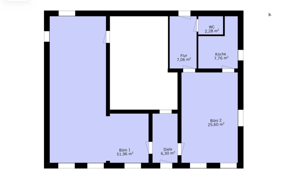 Das Büro wird über einen gemeinschaftlich genutzten Flur betreten. Es handelt sich um zwei verbundene Räume, welche vor 3 Jahren renoviert wurden.
