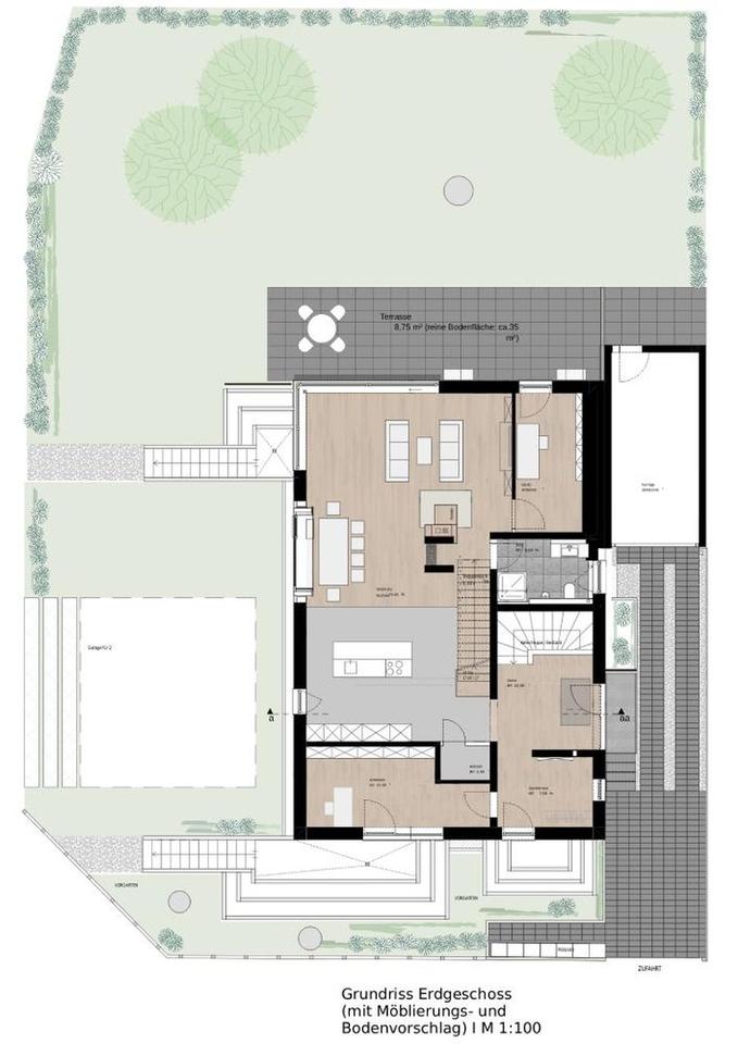 – EG: Großzügiger Wohnbereich (ca. 80 m²) mit Küche und freistehender Insel (Planung), Essbereich mit Sitzfenster und Wohnzimmer mit HS-Tür zur Terrasse, geräumiger Eingangsbereich, 2 Arbeitszimmer und Gästebad, dunkle Mittelholmtreppe in OG, Kellerzugang